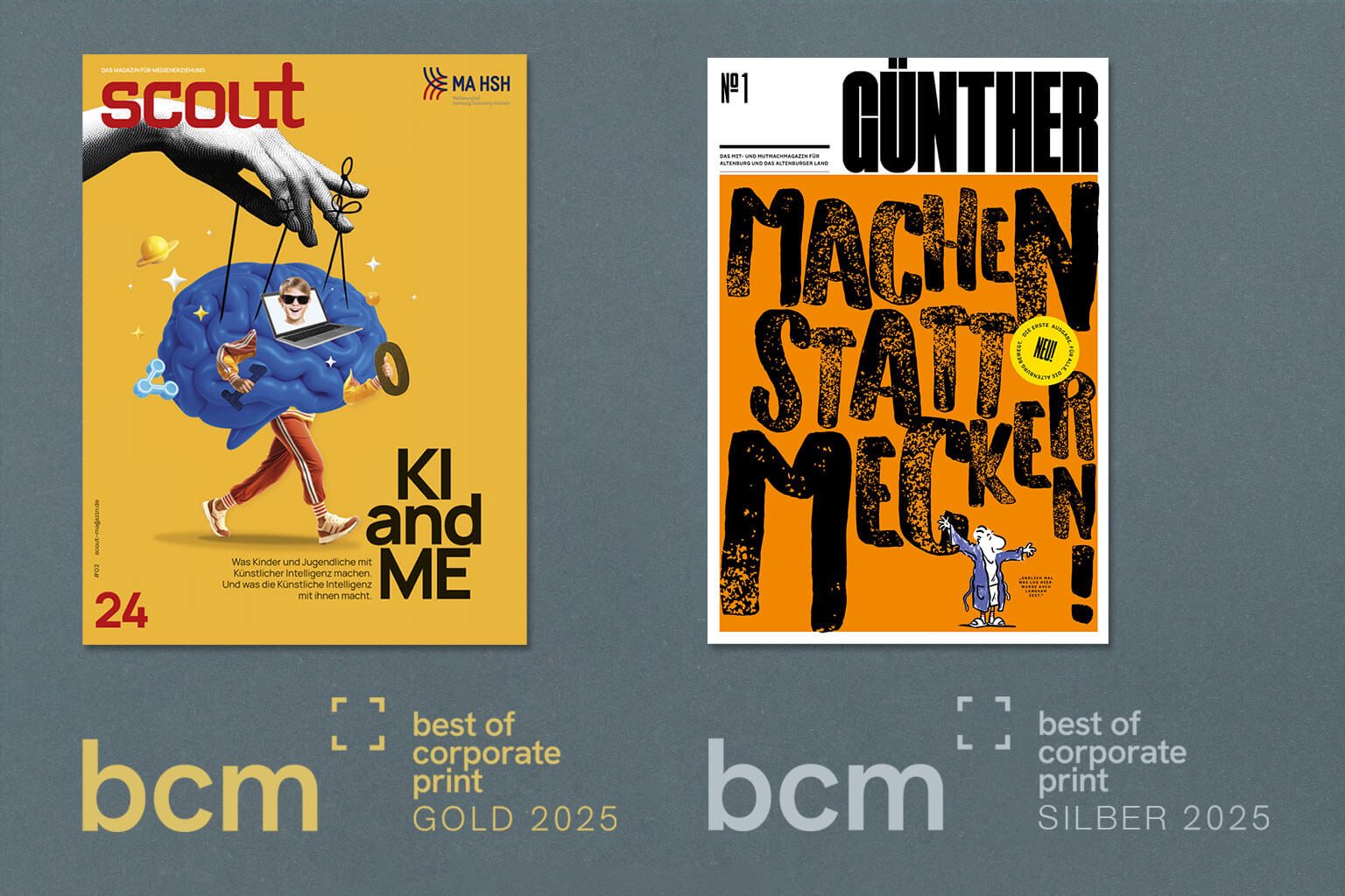 Eine Auszeichnung in Gold hat „scout“, das Magazin das Magazin der Medienanstalt Hamburg/Schleswig-Holstein in der Kategorie „B2C – Kultur/Lernen/Erziehung/Kinder“ eingesammelt. Gekürt wurde die Ausgabe „KI and ME“, die sich mit der Bedeutung von Künstlicher Intelligenz für junge Menschen beschäftigt. Das Heftkonzept stammt von Andreas Beerlage. Für das Editorial Design sind Wolgang Behnken und Sandra Sodemann für Behnken Becker + Partner verantwortlich. Die Collagen dieser Ausgabe hat Alexandra von Béry gestaltet.